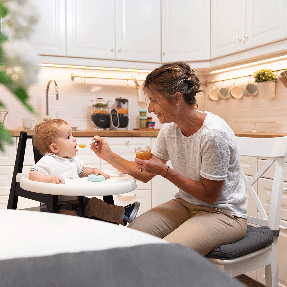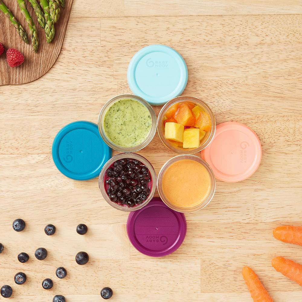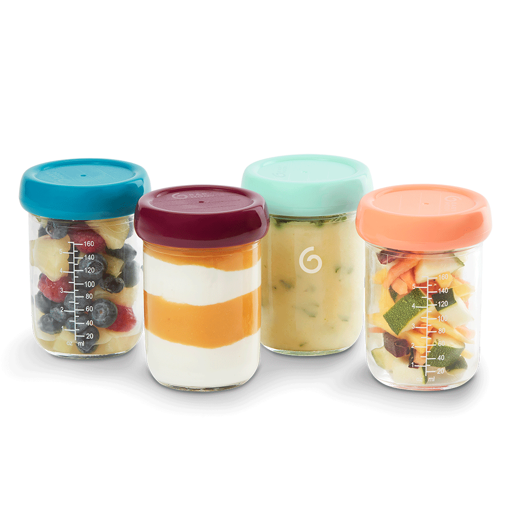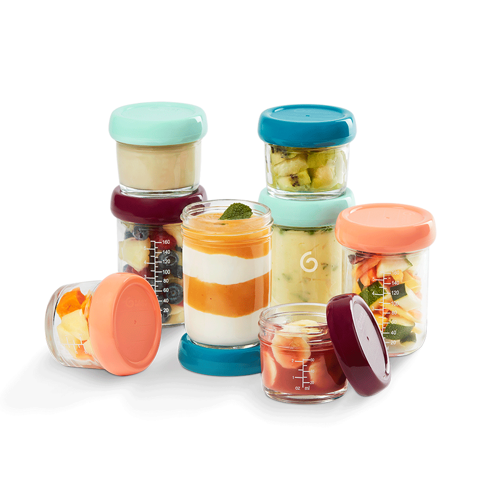 Composición: Recipientes: cristal de borosilicato Tapas: 100 % Silicona, sin BPA Mantenimiento: Apto para lavavajillas Dimensiones del producto (L. x P. x H.): Ø 7 x 9,5 cm